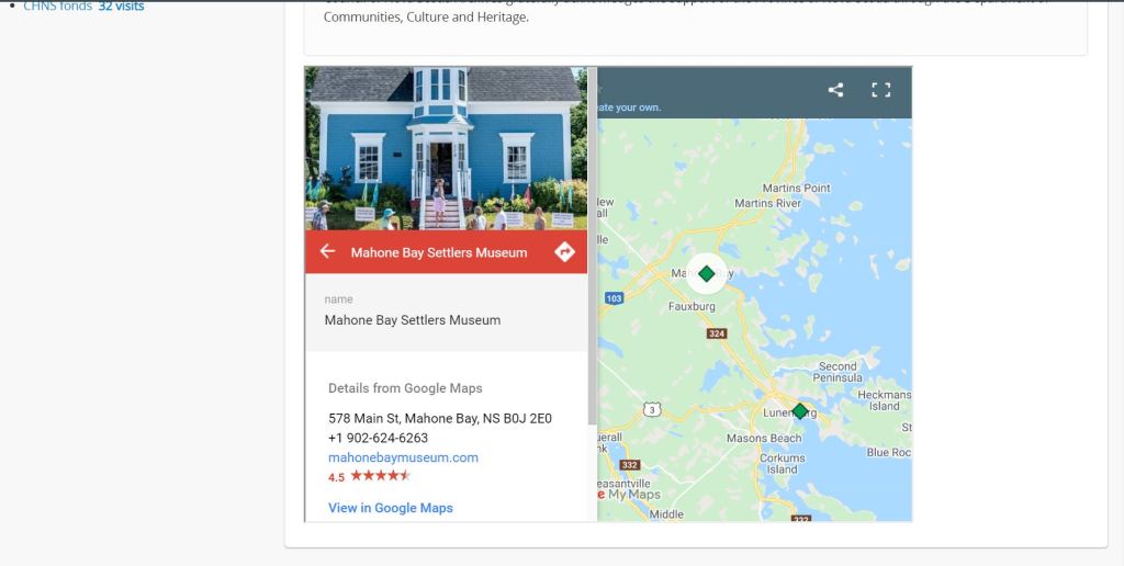 Just zoom in and find your location of interest. I have ancestors on both sides of my tree with Nova Scotia roots. My maternal side is Acadian, and one line of paternal side spread out between Lunenburg and Halifax. One of the locations they lived was Mahone Bay. When I zoomed in on the map, there is 1 archive located right in Mahone Bay. I click on the marker, and up pops the contact information for the Mahone Bay Settlers Museum.