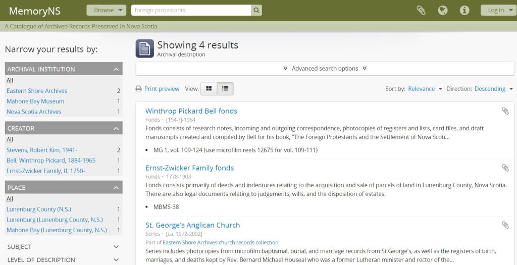 With 62 institutions contributing, there’s thousands of record sets in the collection. That’s a lot of records to sift through. By using the search function, you can use keywords to help find what you’re looking for. So, my great grandmother Edna Johnson descended from several lines of the Foreign Protestants who settled the Lunenburg area. When I typed in “Foreign Protestants”, I got four results: