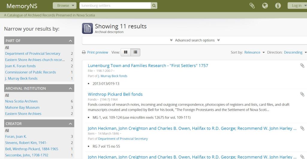 Just to compare, I then typed in “Lunenburg Settlers”, and this time got 11 results: