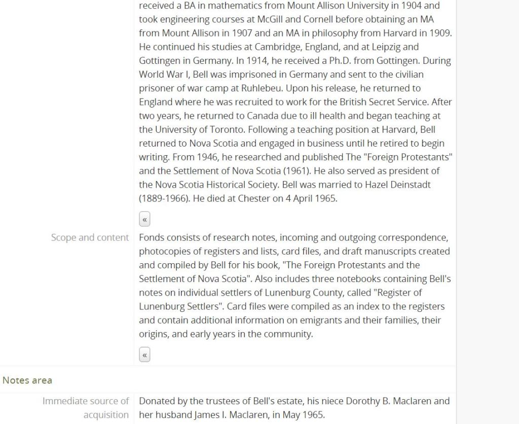 By using the menus at the left, you can narrow the results. When you want to look at a particular collection, just click on the title and it will give you details on the collection and where it’s housed. Some of the descriptions are quite lengthy, but some are not. Here the one for the Winthrop Pickard Bell fonds