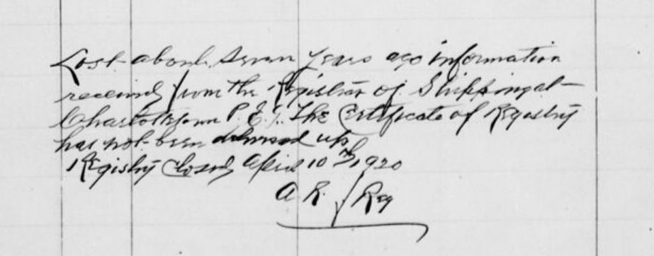 In the case of the Aurore, another Ship’s Registrar’s Office informed Yarmouth Registry that the ship had been lost in about 1913.